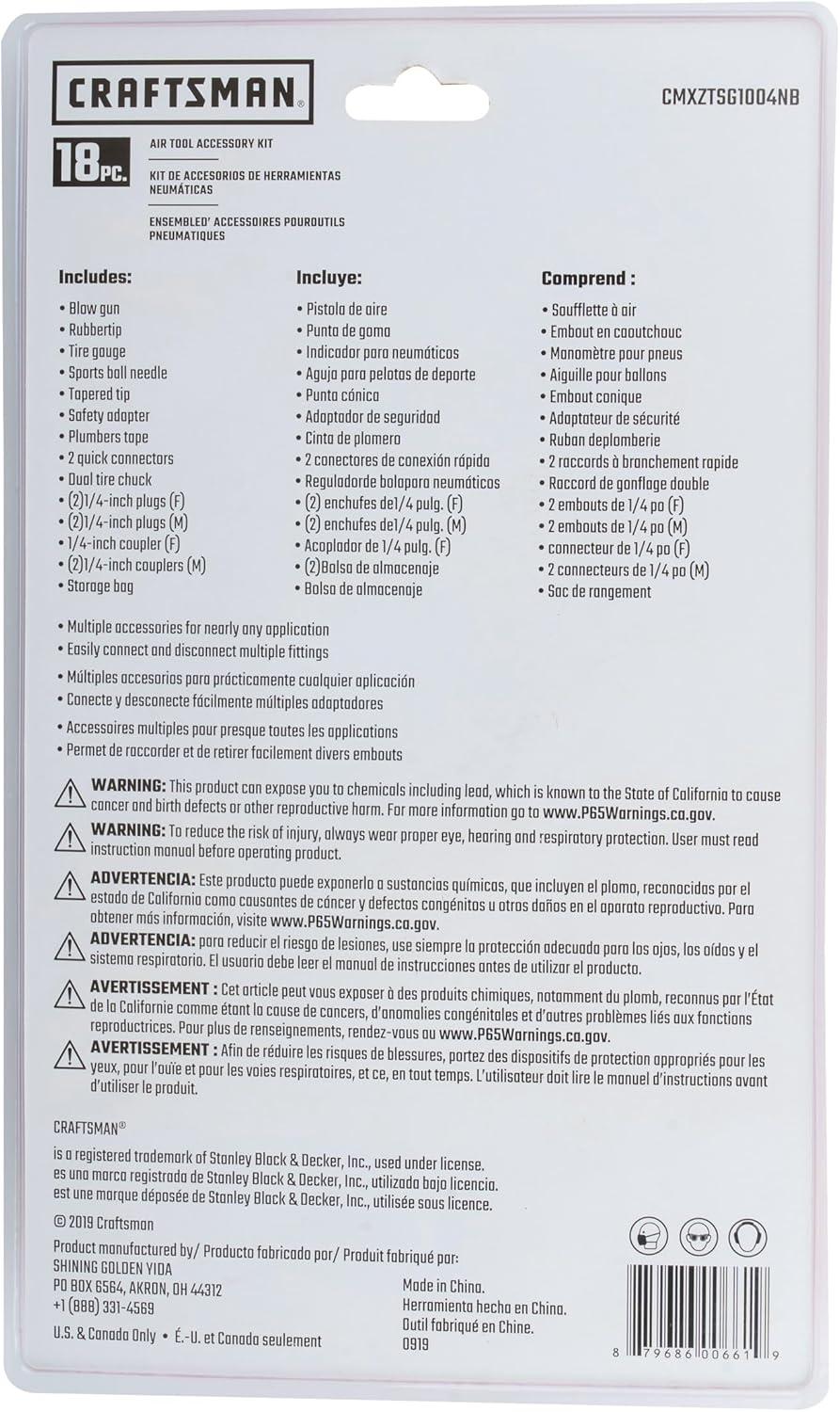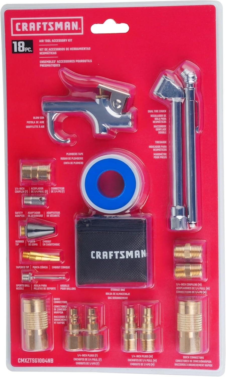 The CRAFTSMAN 18-Piece Air Compressor Accessory Kit is the perfect all-in-one solution for a wide range of applications. This comprehensive kit includes a blow gun, tire gauge, dual-chuck tire inflator, inflation needles, tapered nozzle, brass quick-connect fittings, and more, allowing you to handle inflation tasks, cleaning, and air tool connections with ease. The brass couplers and plugs are designed for durability and corrosion resistance, ensuring long-lasting performance. The kit also includes a zippered storage bag to keep everything organized. Whether you're inflating tires, sports balls, or air mattresses, or cleaning dust and debris from your workspace, this versatile kit provides the accessories you need for the job.