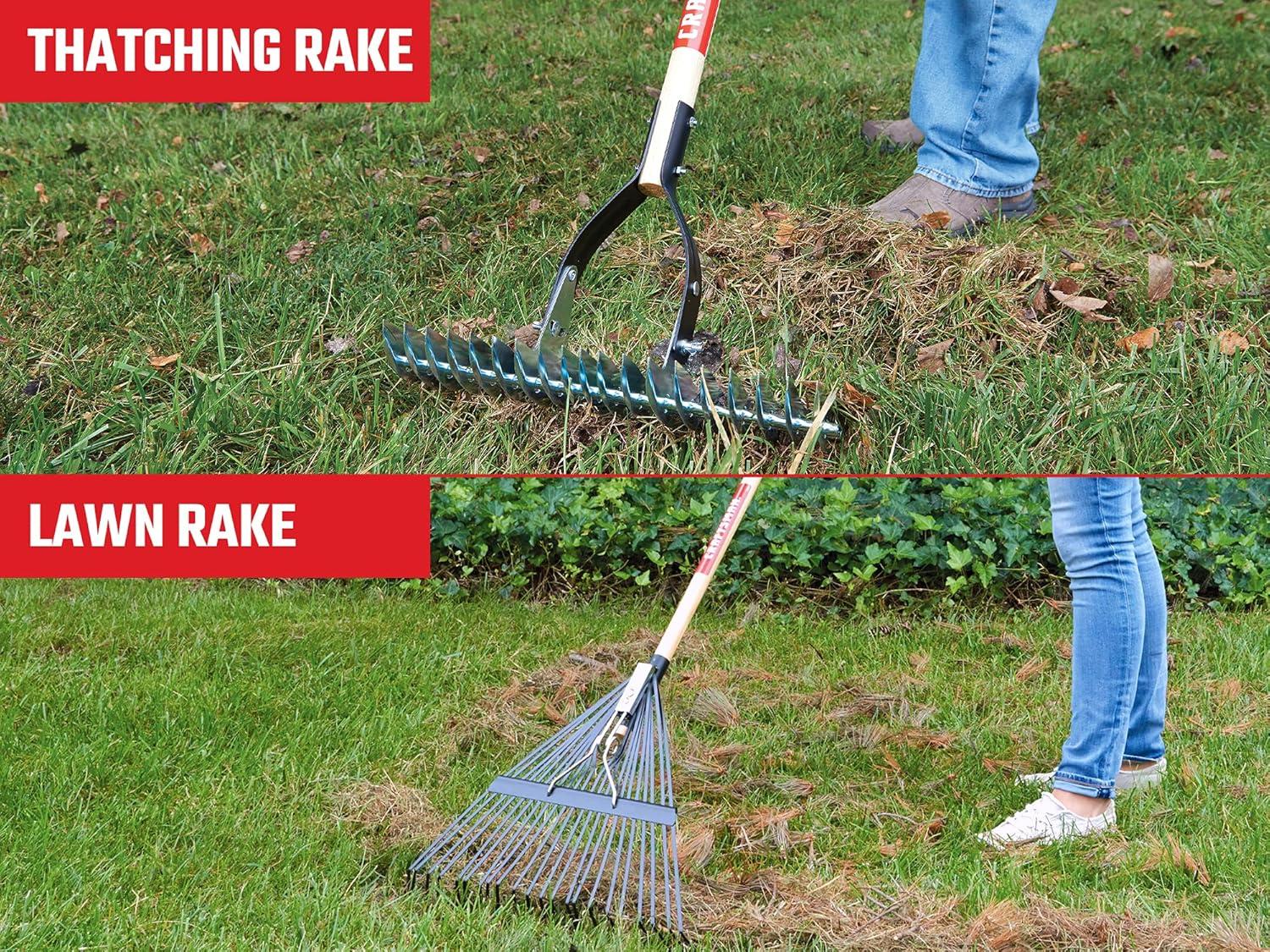 LONG HANDLE TOOL SET: Includes (1) Wood Handle 22 Tine Lawn Rake and (1) Wood Handle Thatching Rake for lawn care and gardening projects