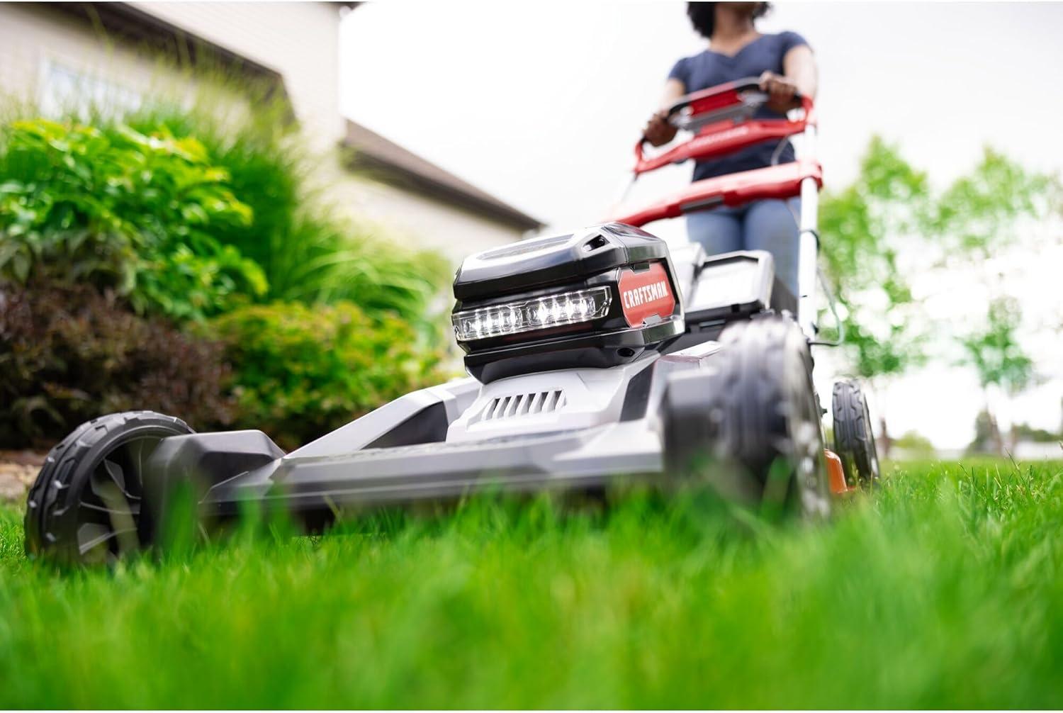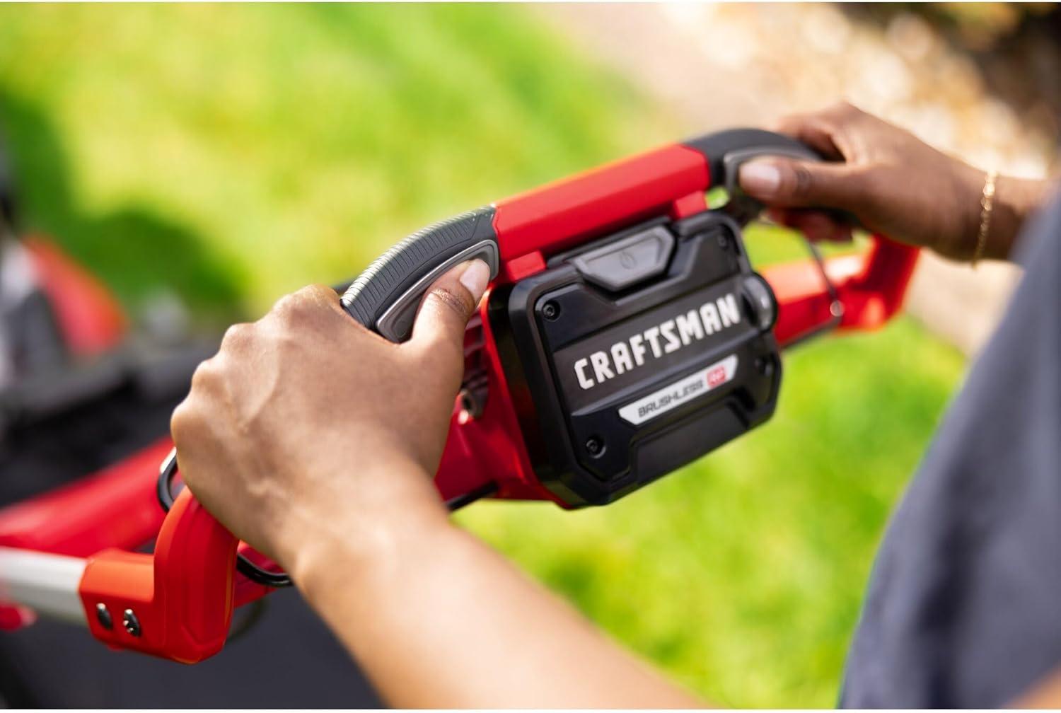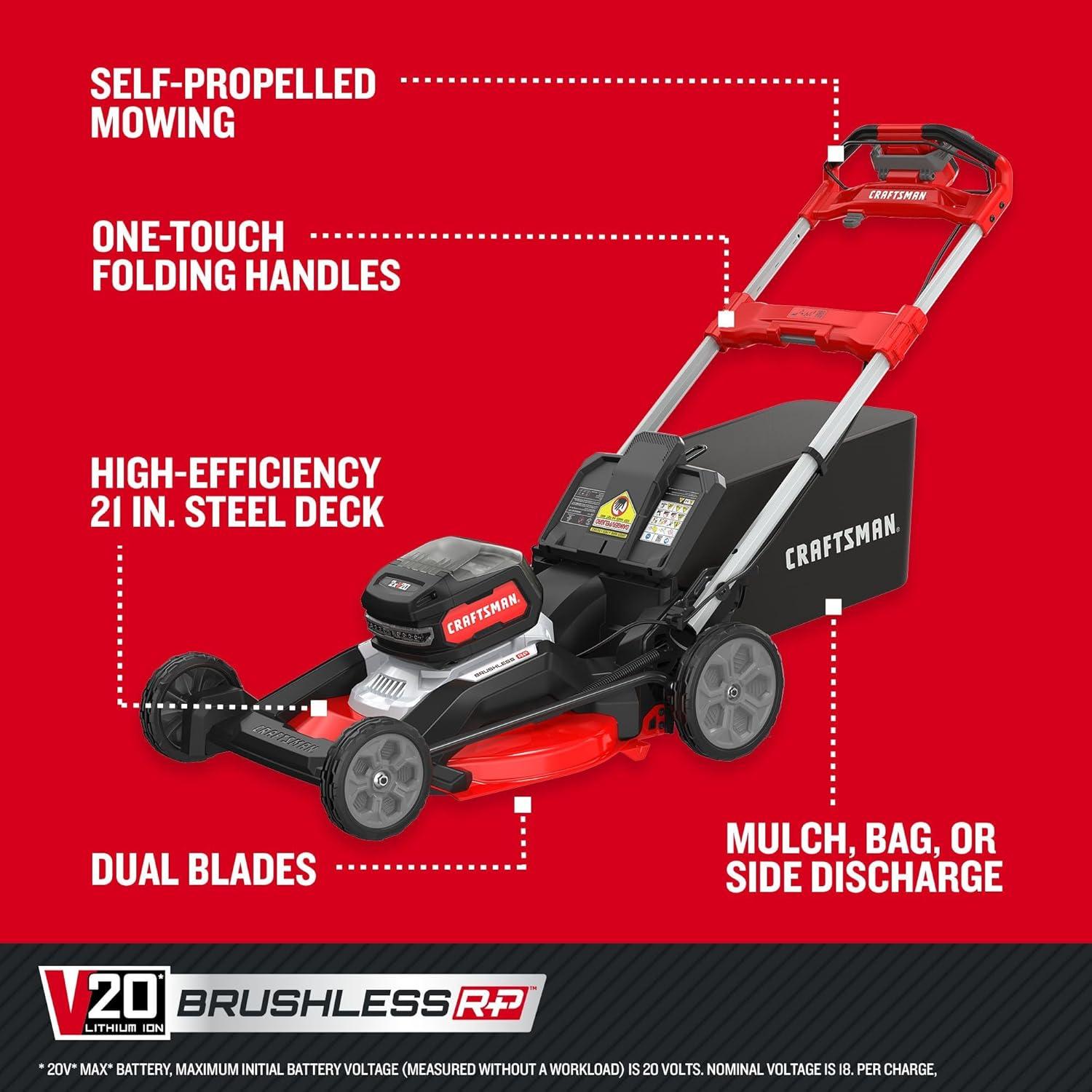 The performance-packed CRAFTSMAN 2xV20* BRUSHLESS RP 21 in. Self-Propelled Mower features a high-efficiency cutting system with dual blades designed to minimize energy use, which helps maximize runtime. A convenient one-touch folding handle and integrated vertical storage take 79% less space in vertical storage vs in operation.** Its brushless, direct-drive motor provides more runtime and better performance with two V20* 9Ah batteries (included), providing up to 70 minutes of runtime for a lawn that's the pride of the neighborhood.