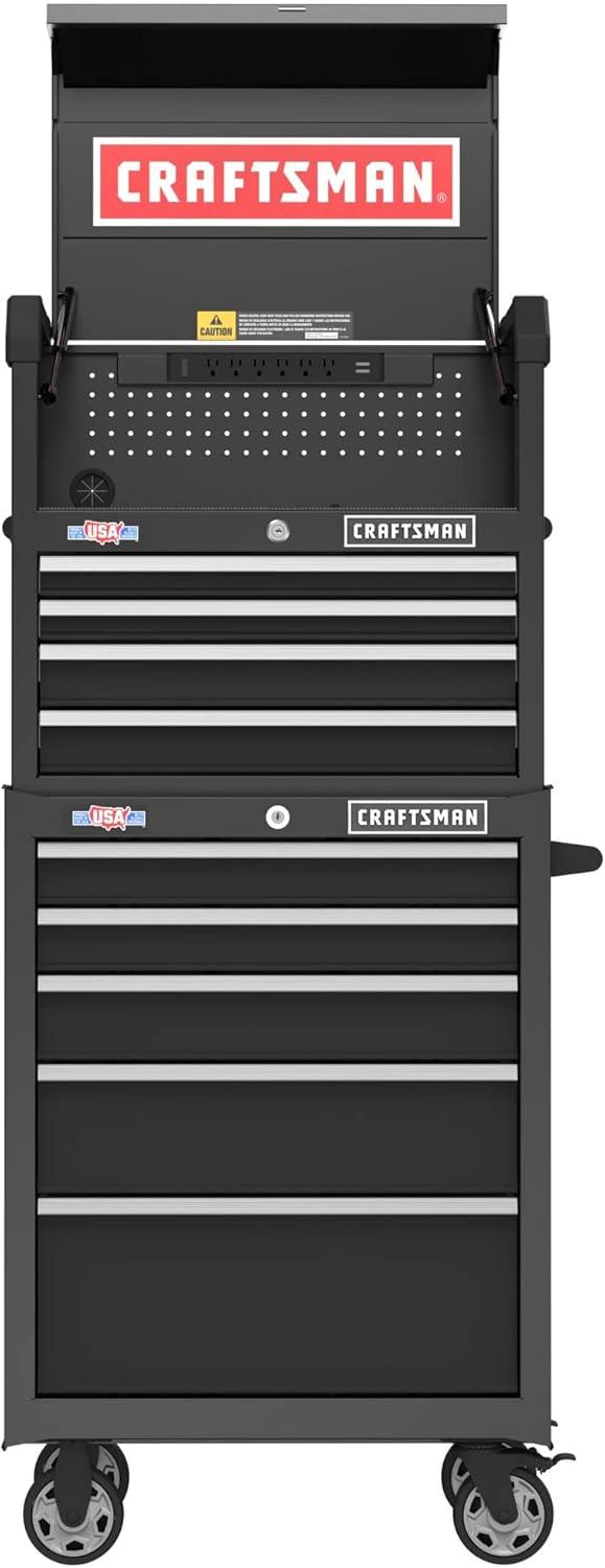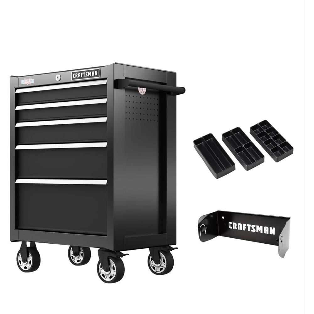 The CRAFTSMAN S2000 27-in Wide 5-Drawer Rolling Tool Cabinet is Made in the USA with Global Materials and has a steel I-Frame® construction. This rolling cabinet has full extension, soft-close drawer slides with a 100-lb drawer capacity. The 5”x2” casters with over toe-locking brakes have a 1,500-lb load rating. The full-grip, tubular side handle allows for easy mobility. Safeguard tools with the internal locking system and over-molded keys. Includes Cabinet Drawer Trays and a Magnetic Paper Towel Holder.