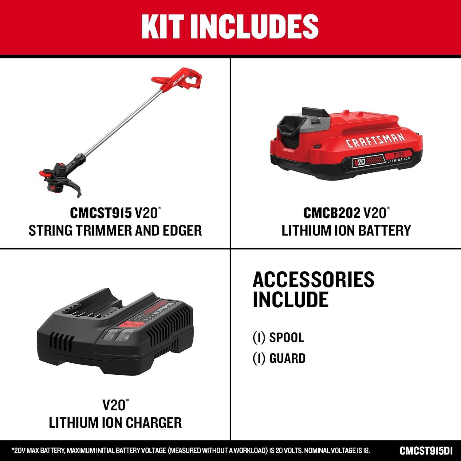 CRAFTSMAN V20 Cordless 10 in. WEEDWACKER String Trimmer and Edger Kit with 2.0 Ah Battery and Charger (CMCST915D1)
